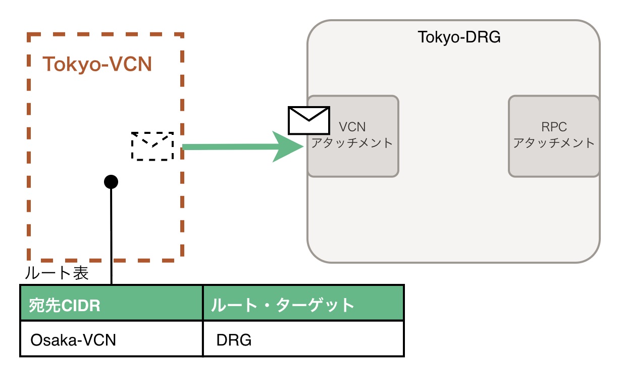 まず、Tokyo-VCNにいるパケットは、サブネットに紐づいたルート表によってDRGに誘導されますね。