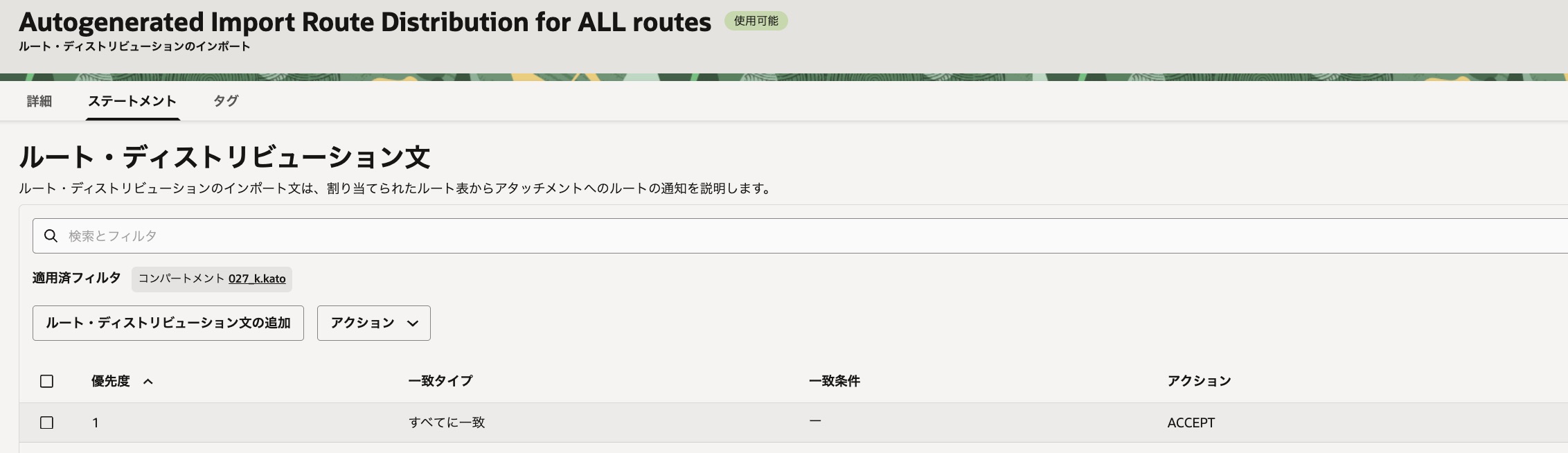 つまり、「VCNアタッチメントからのルートのみ」をインポートしています。