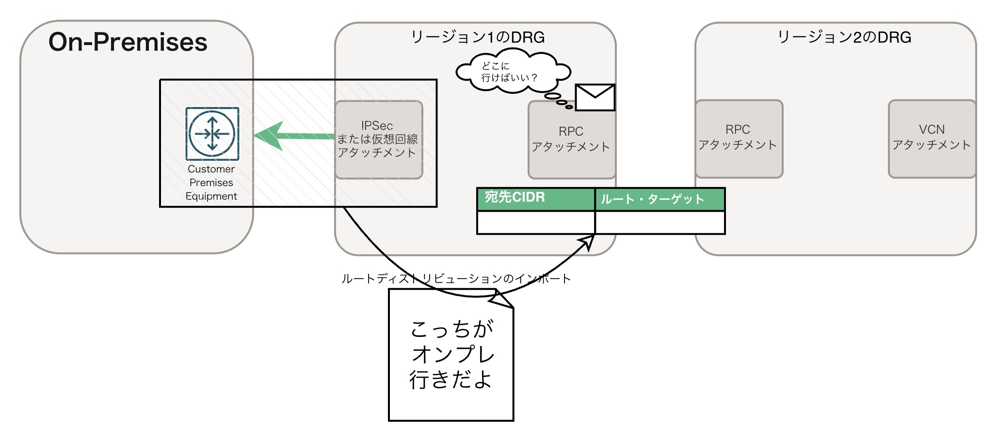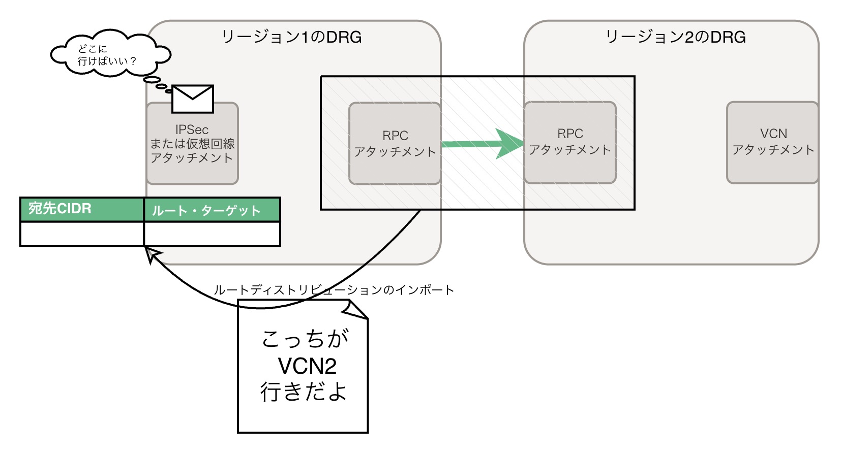 理由は単純なのですが、「RPC/IPSec/仮想回線アタッチメントからは、デフォルトでVCNアタッチメントにしか、ルーティングされない」からです。