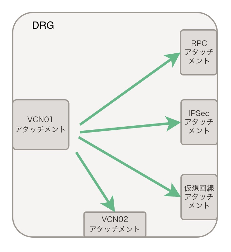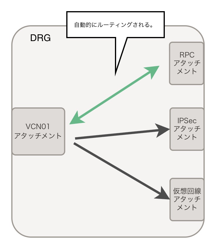 これが関連づけられたDRGルート表は、IPSec、仮想回線、RPCアタッチメントに自動的に紐づきます。