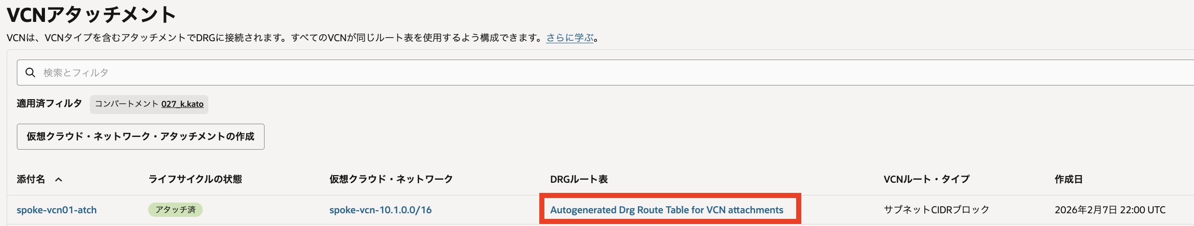 これは、VCNアタッチメント用のDRGルート表に紐づくものです。