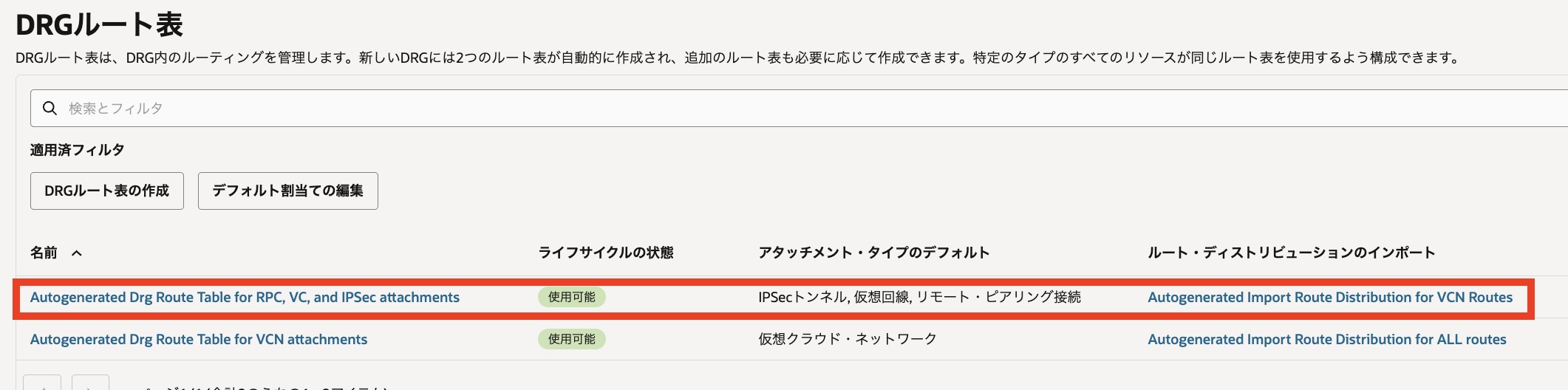 このルート・ディストリビューションで作成されるのが、「Autogenerated Drg Route Table for RPC, VC, and IPSec attachments」というDRGルート表です。