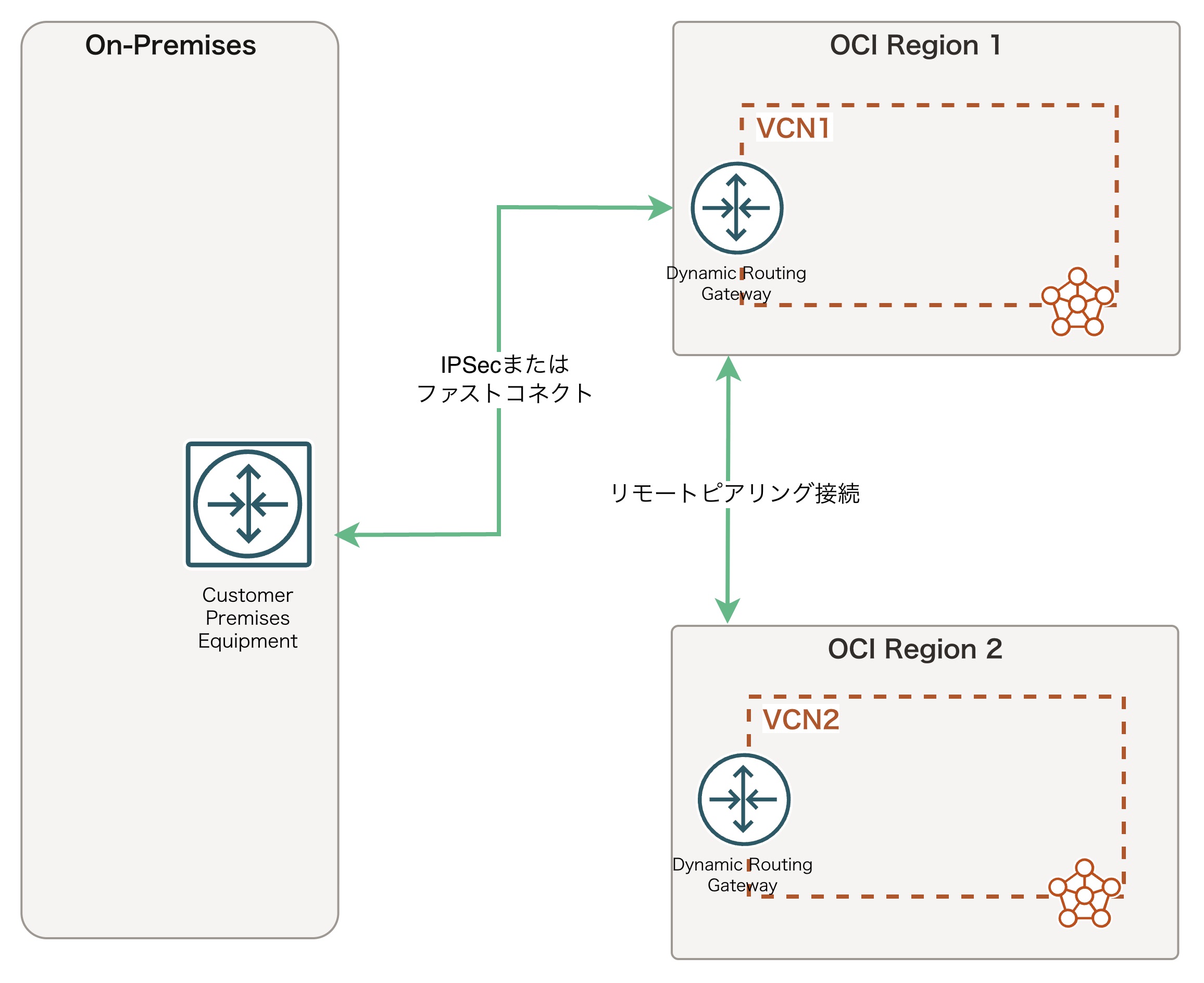 この図を見てみると、オンプレミスからVCN1との接続が確立されており、VCN同士はリモートピアリングによって接続されていますね。