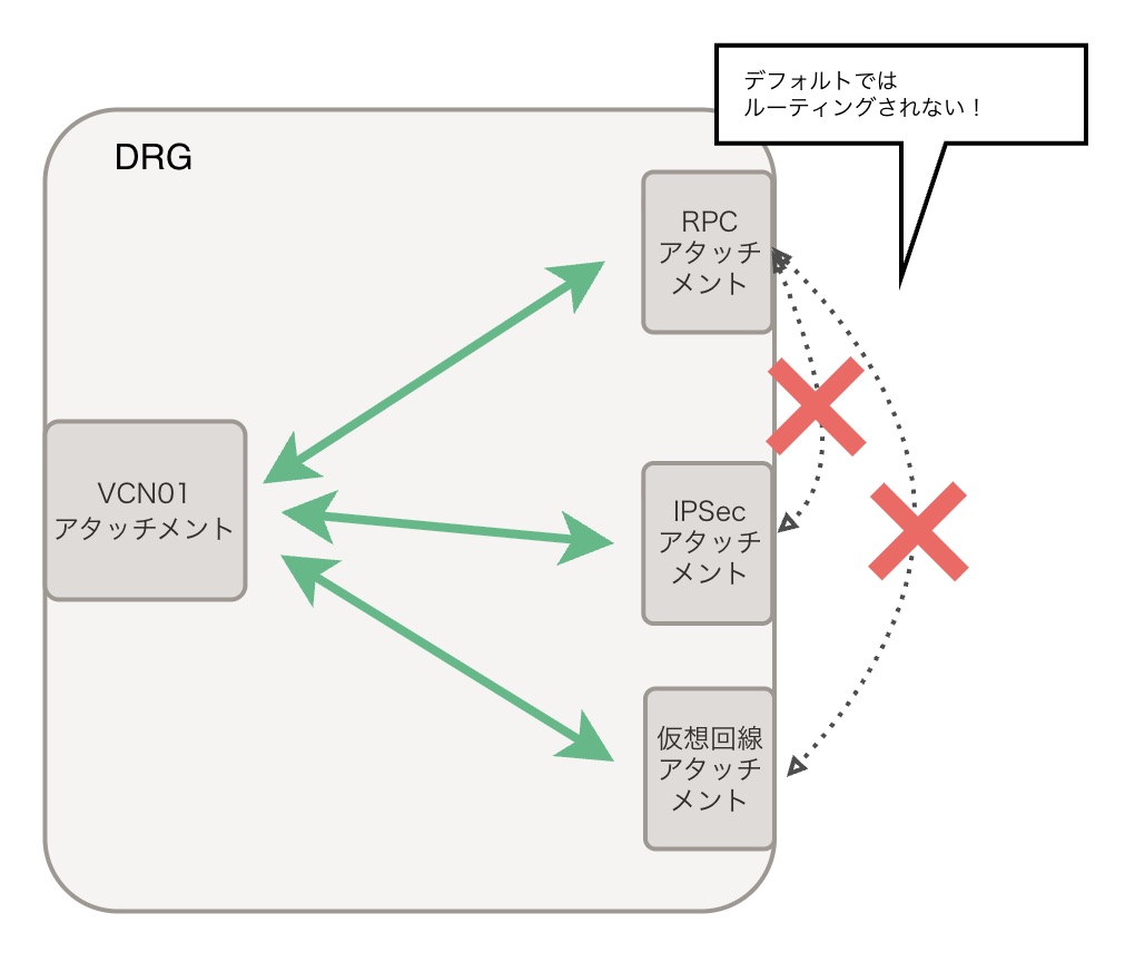 VCNアタッチメントからは、すべてのアタッチメントへ(VCN/IPSec/VC/RPCアタッチメント)ルーティングされるというのがデフォルトなんです!