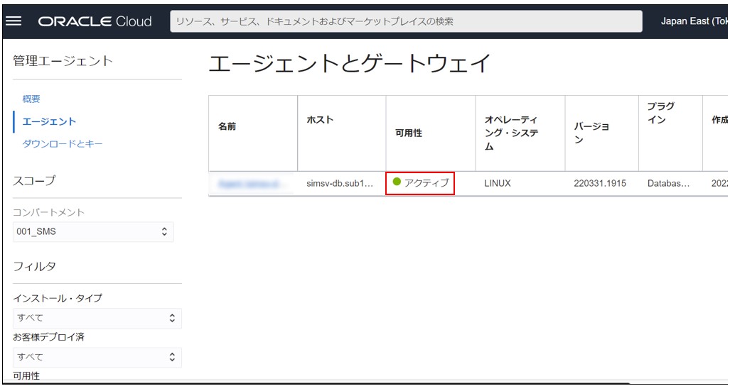 正しくインストールが完了すると、OCIの管理エージェント画面上にエージェントをインストールしたホストが表示されます。