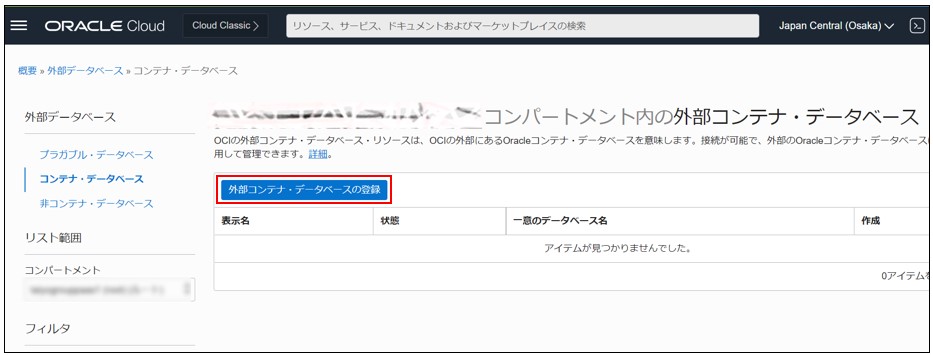 外部データベース → コンテナ・データベース画面より、外部コンテナ・データベースの登録]ボタンを押します。