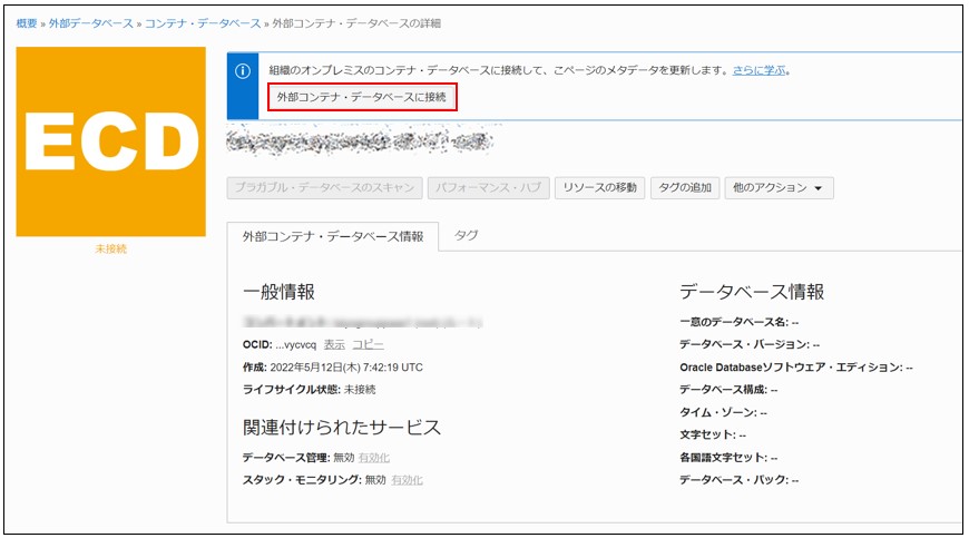 詳細画面に推移するので、画面の表示に従って[外部コンテナ・データベースに接続]ボタンを押します。