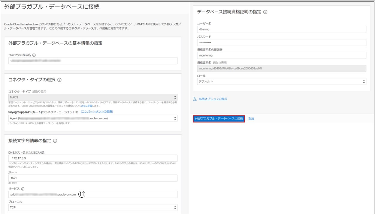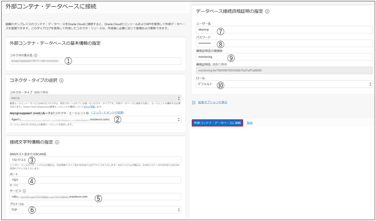 表示された画面に従って値を入力します。入力が完了したら、[外部コンテナ・データベースの接続]ボタンを押します。