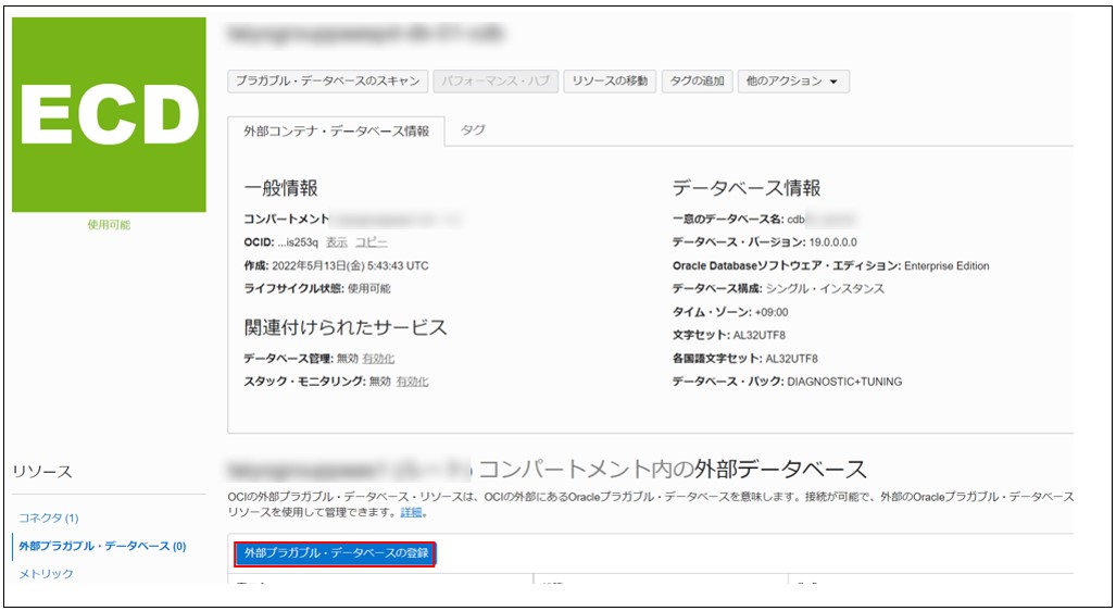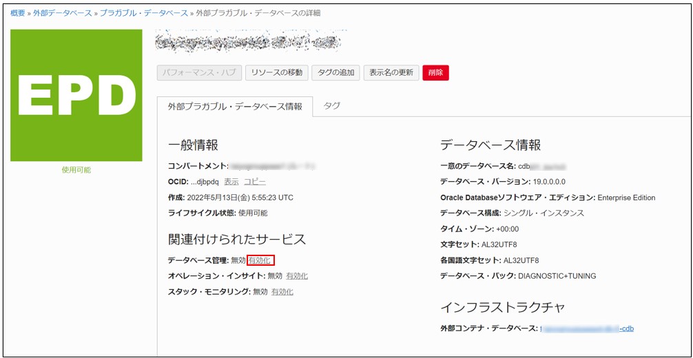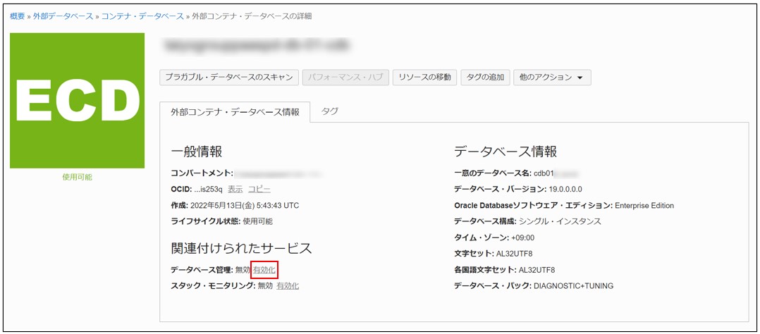 外部プラガブル・データベースの詳細画面_データベース管理有効化