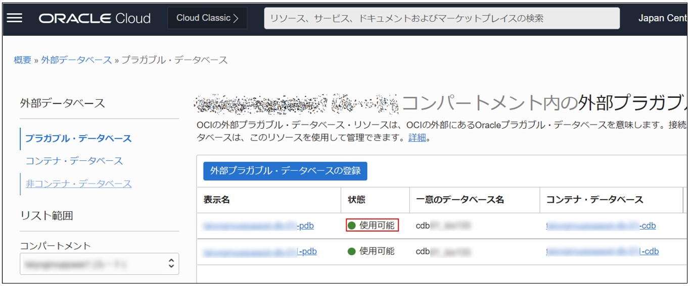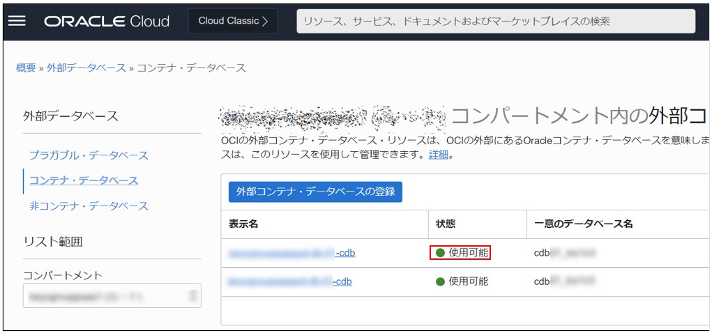 ここまでの作業で、外部コンテナ・データベース及び外部プラガブル・データベースの選択画面に「使用可能」と表示されたそれぞれのリソースが表示されます。