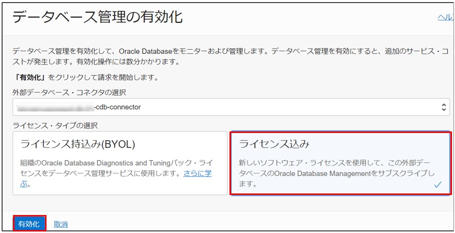 「外部コンテナ・データベースの接続」作成時に入力したコネクタ名を選択し[有効化]ボタンを押します。
