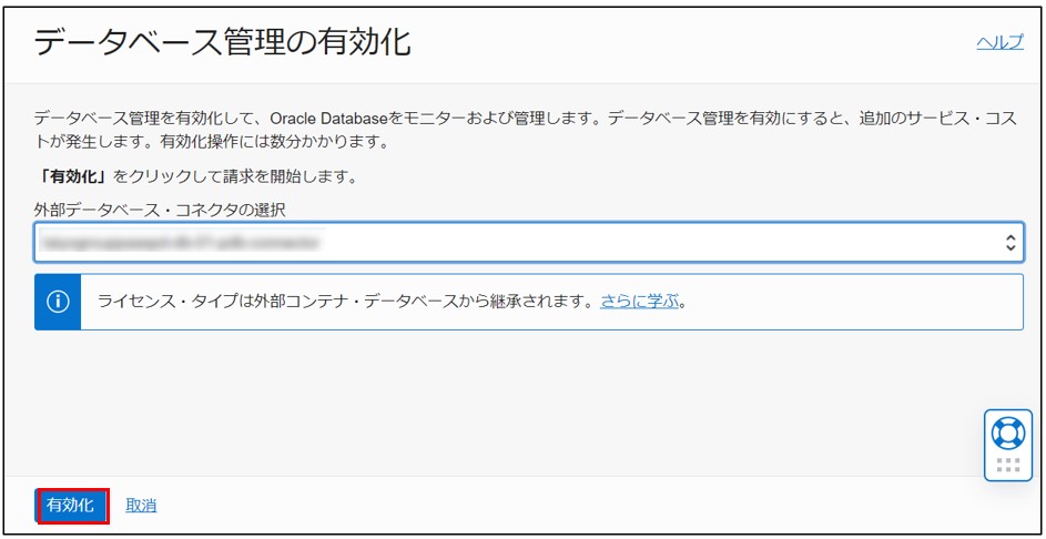外部コンテナ・データベースの詳細画面にデータベース管理の[有効化]ボタンが表示されているので、[有効化]ボタンを押します。