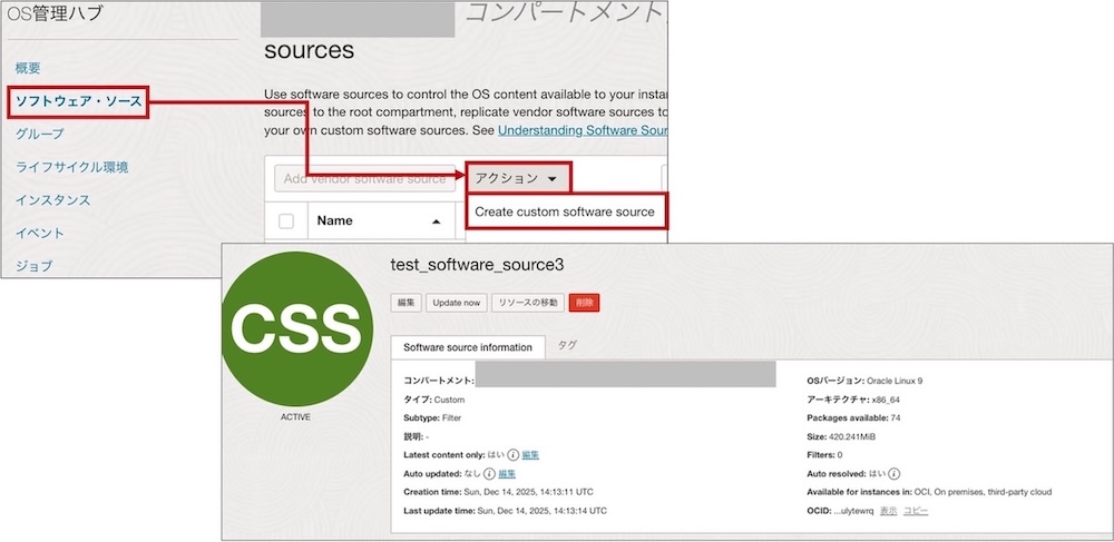 OS管理ハブのリストから[ソフトウェア・ソース] → [アクション] → [Create custom software source]に移動します。自動更新の有無やOSベンダーを選択し、画面の案内に従って作成します。