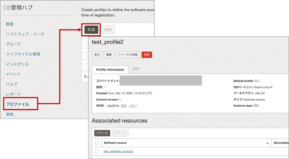 OS管理ハブのリストから[プロファイル] → [作成] に移動します。配置場所(OCI/オンプレ/他クラウド)、OSベンダーなどを指定して作成します。