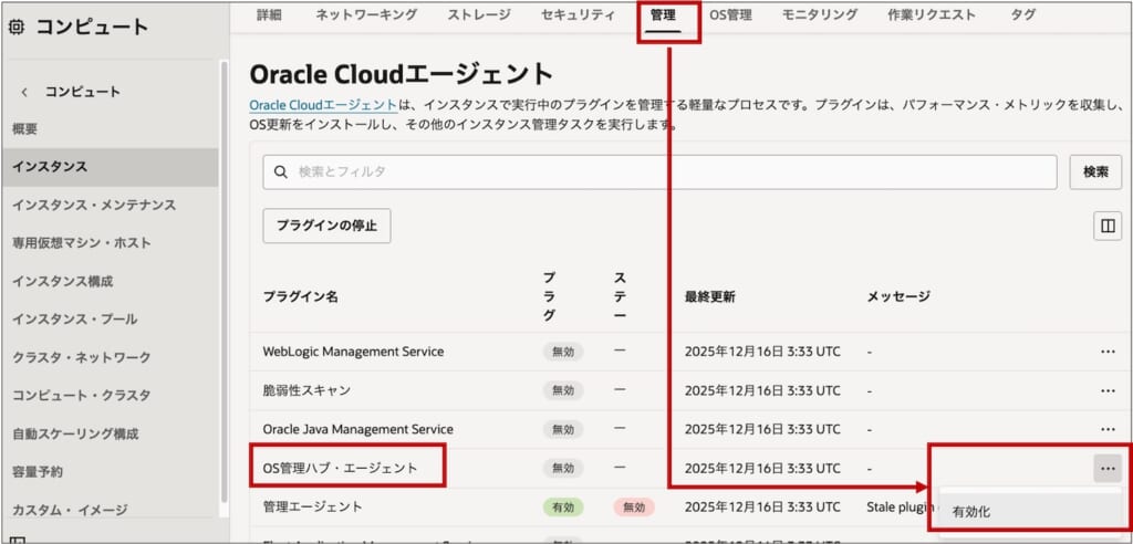 対象インスタンス詳細画面 → [管理]タブ → [Oracle Cloudエージェント] → [OS管理ハブ・エージェント]で作成したプロファイルを指定して有効化します。