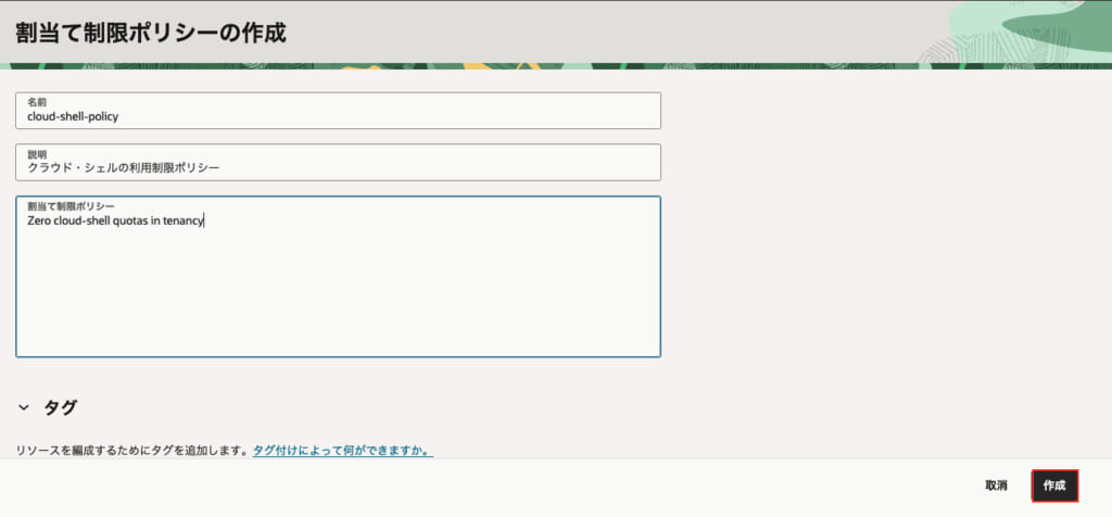 - 説明:任意(ここでは「クラウド・シェルの利用制限ポリシー」)