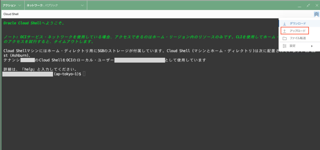 クラウド・シェルは、ローカル環境にあるファイルをクラウド・シェルのホームディレクトリへアップロードできます。