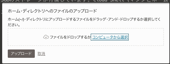 注意点として、クラウド・シェルはホームディレクトリのみアップロード先として指定でき、他のパスは選択できません。
