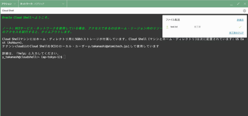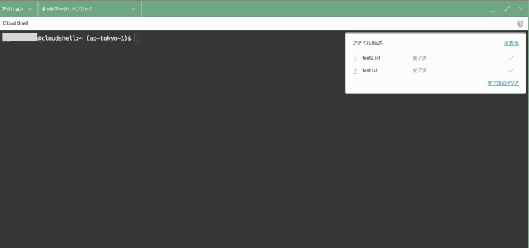 「アップロード」を選択すると、画面右上に進捗ステータスが表示され「完了済」となるとクラウド・シェルへのアップロードが完了します。
