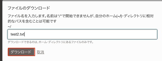 表示されたポップアップに、ダウンロードしたいファイル名(ここでは「test2.txt」)を入力、「ダウンロード」を選択します。