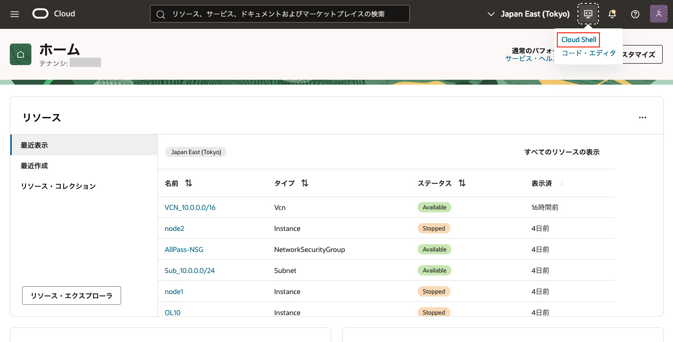 クラウド・シェル(Cloud Shell)とは、OCIコンソール上で利用可能なターミナル環境です。