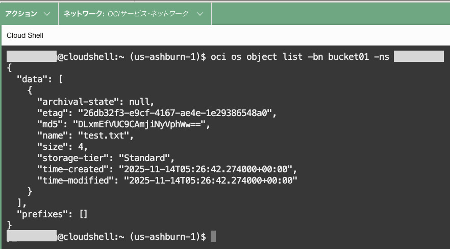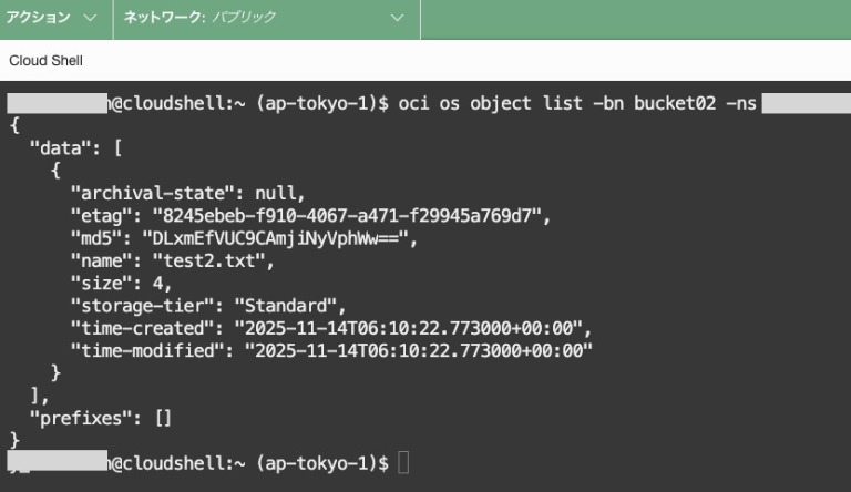 例として、ホーム・リージョン外に作成したオブジェクト・ストレージ・バケット内のオブジェクト情報を取得してみます。