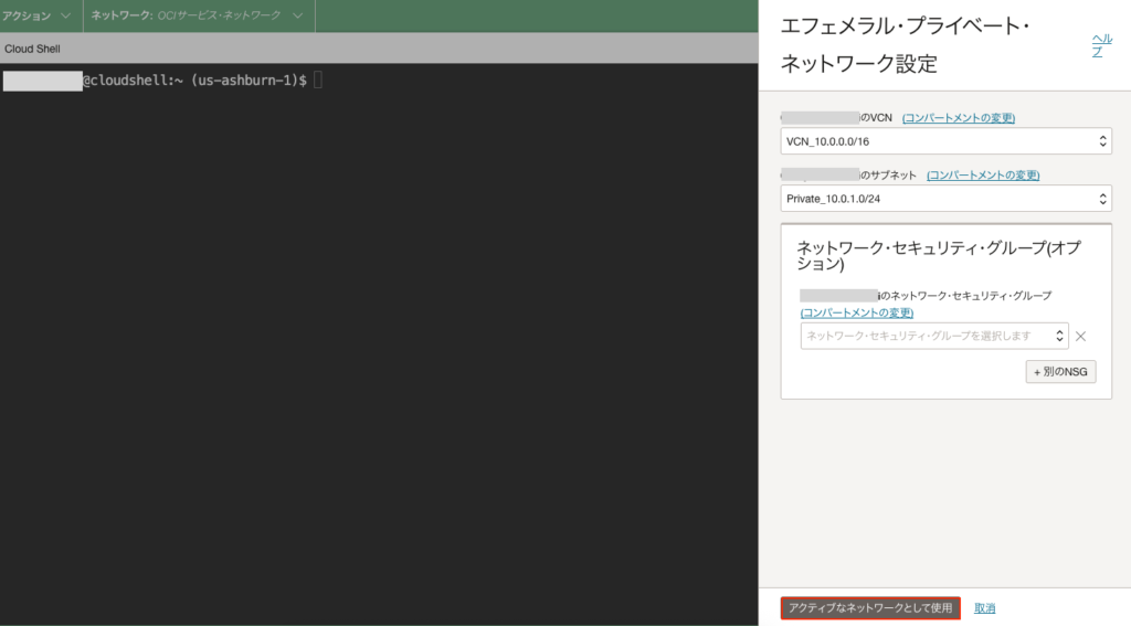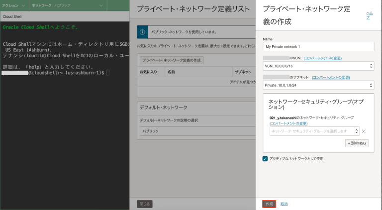- アクティブなネットワークとして使用:チェックすると、作成後クラウド・シェルが自動でこの定義に接続