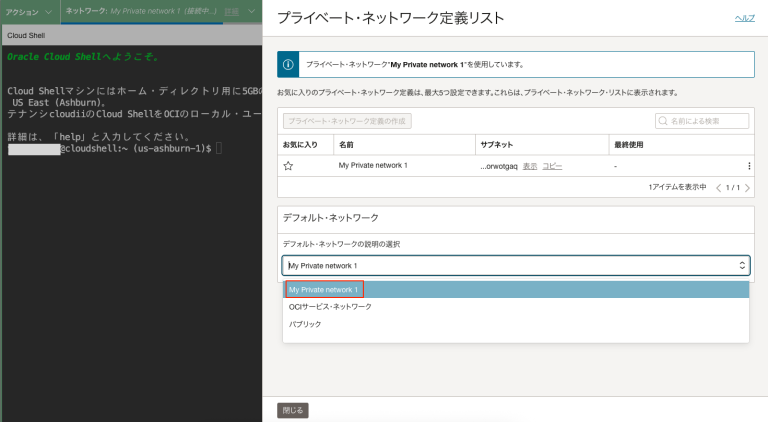 クラウド・シェル起動時に自動でプライベート・ネットワークへ接続させたい場合は、デフォルト・ネットワークをプライベート・ネットワーク定義に変更します。