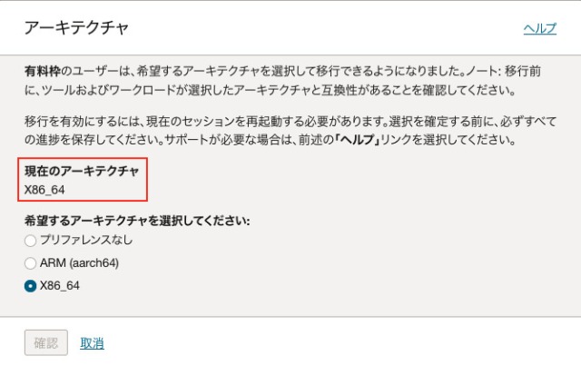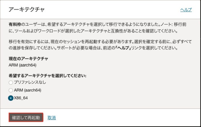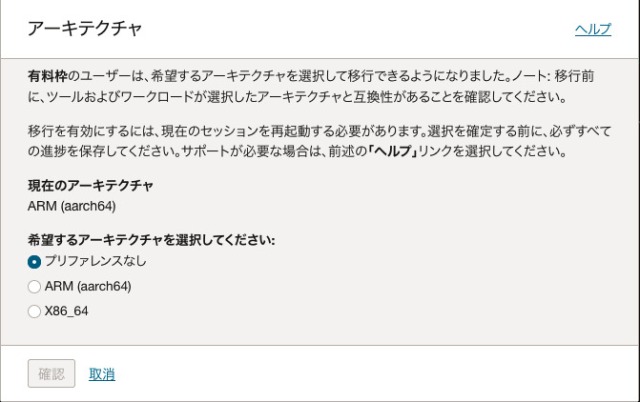 画面では「ARM (aarch64)」となっていますが、デフォルトでは現在のアーキテクチャは「プリファレンスなし」と表示されます。