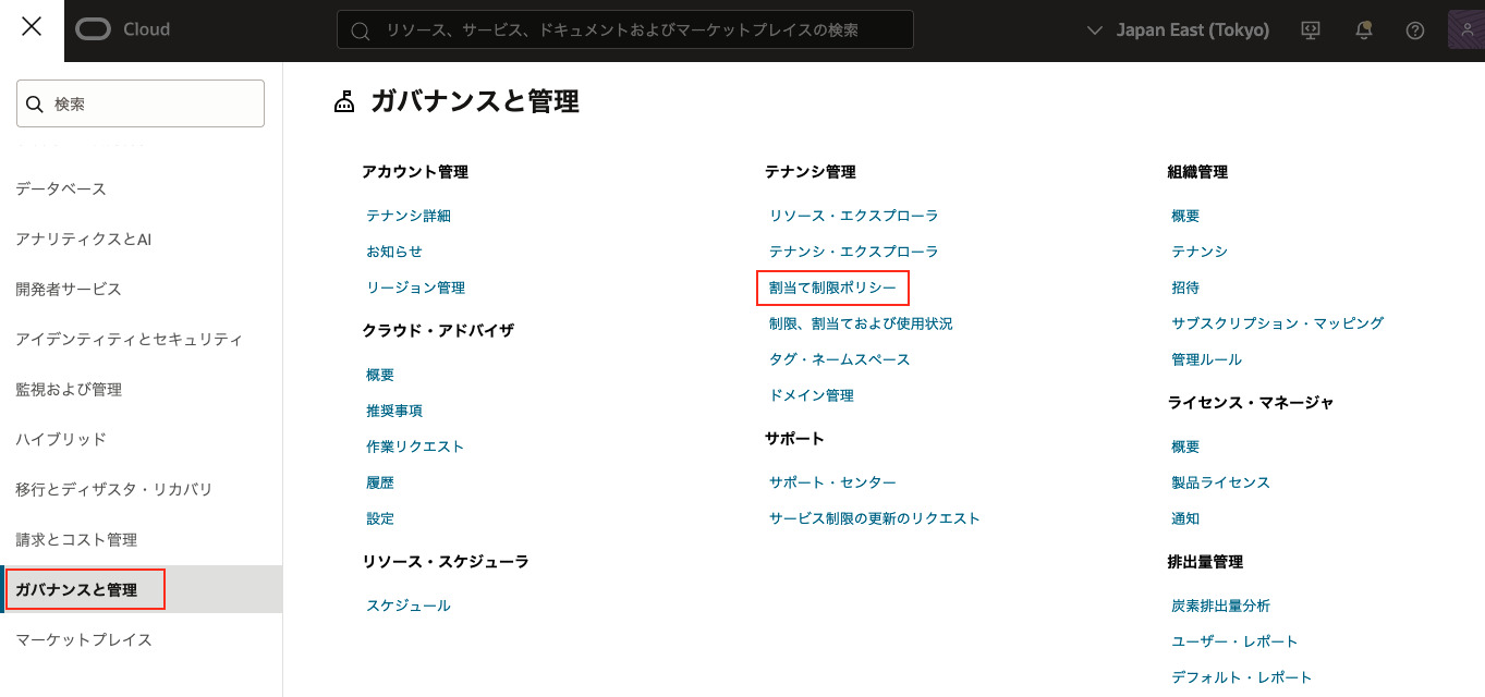設定手順について、「ガバナンスと管理」→「割当て制限ポリシー」を選択します。