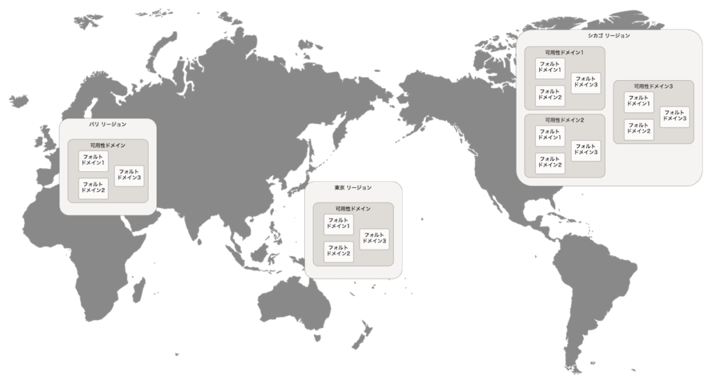 「リージョン」「可用性ドメイン(AD)」「フォルトドメイン(FD)」は、障害対策のためOCIが用意した物理的な場所を指す用語です。