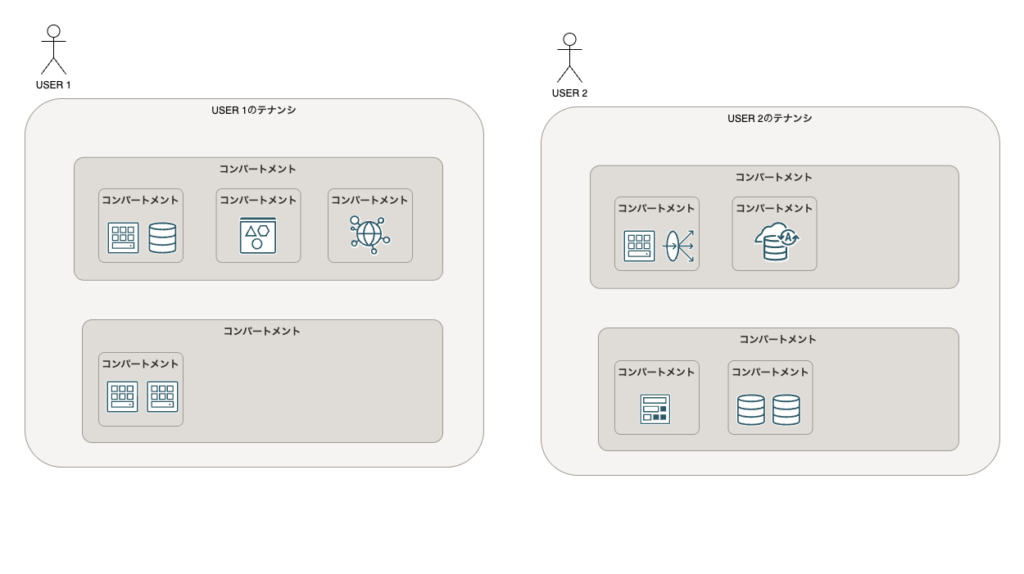 ただ、実際にどのように利用するかはユーザ側で任意に決められるので、テナンシ、コンパートメントどちらも1つずつで運用することもできれば、複数のテナンシ、コンパートメントを作成し運用することも可能です。