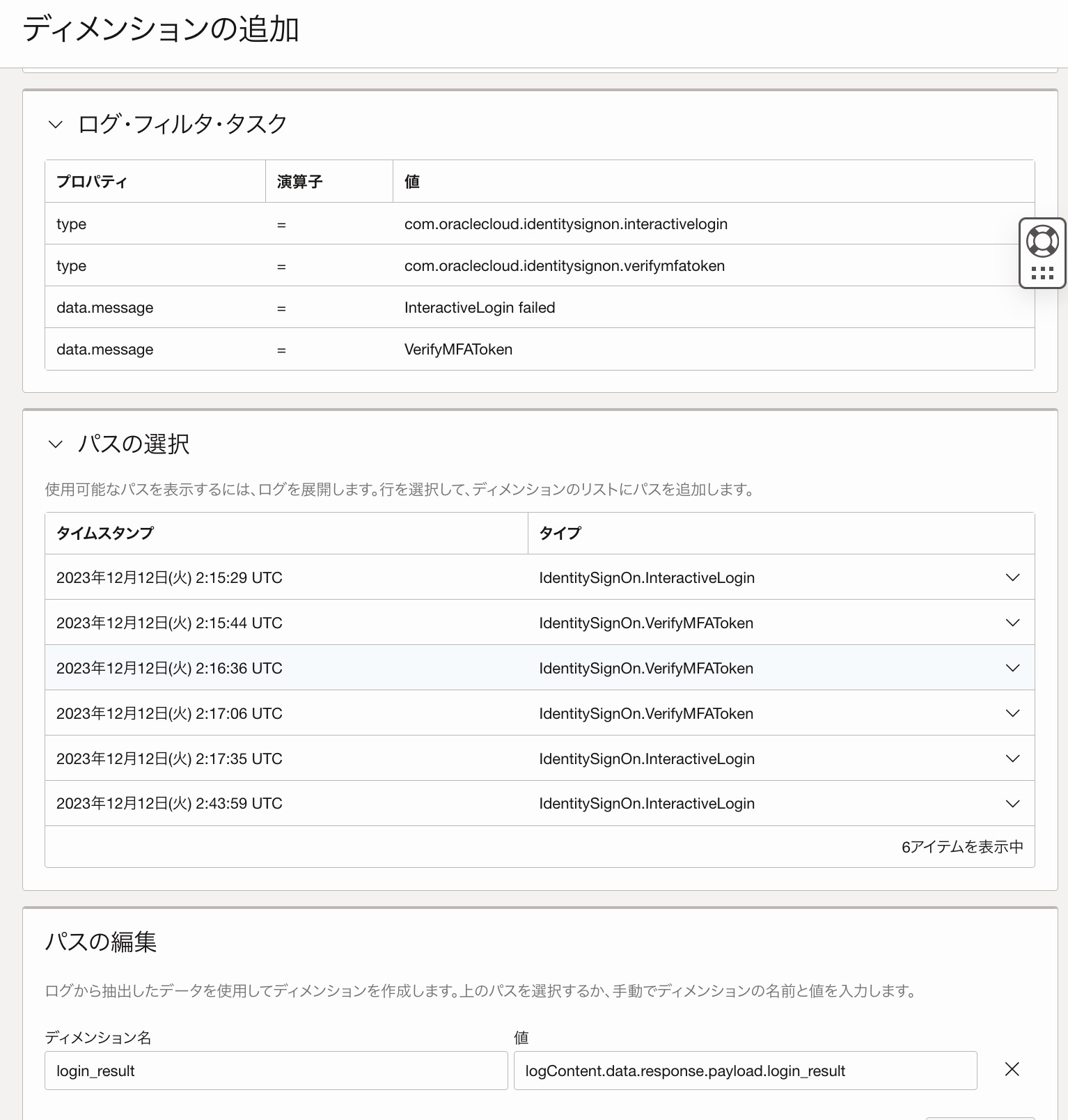 なお、"パスの選択"画面でログレコードを開くと、フィールドの一覧が出てきて、チェックボックスを入れてディメンションとして指定することができます。