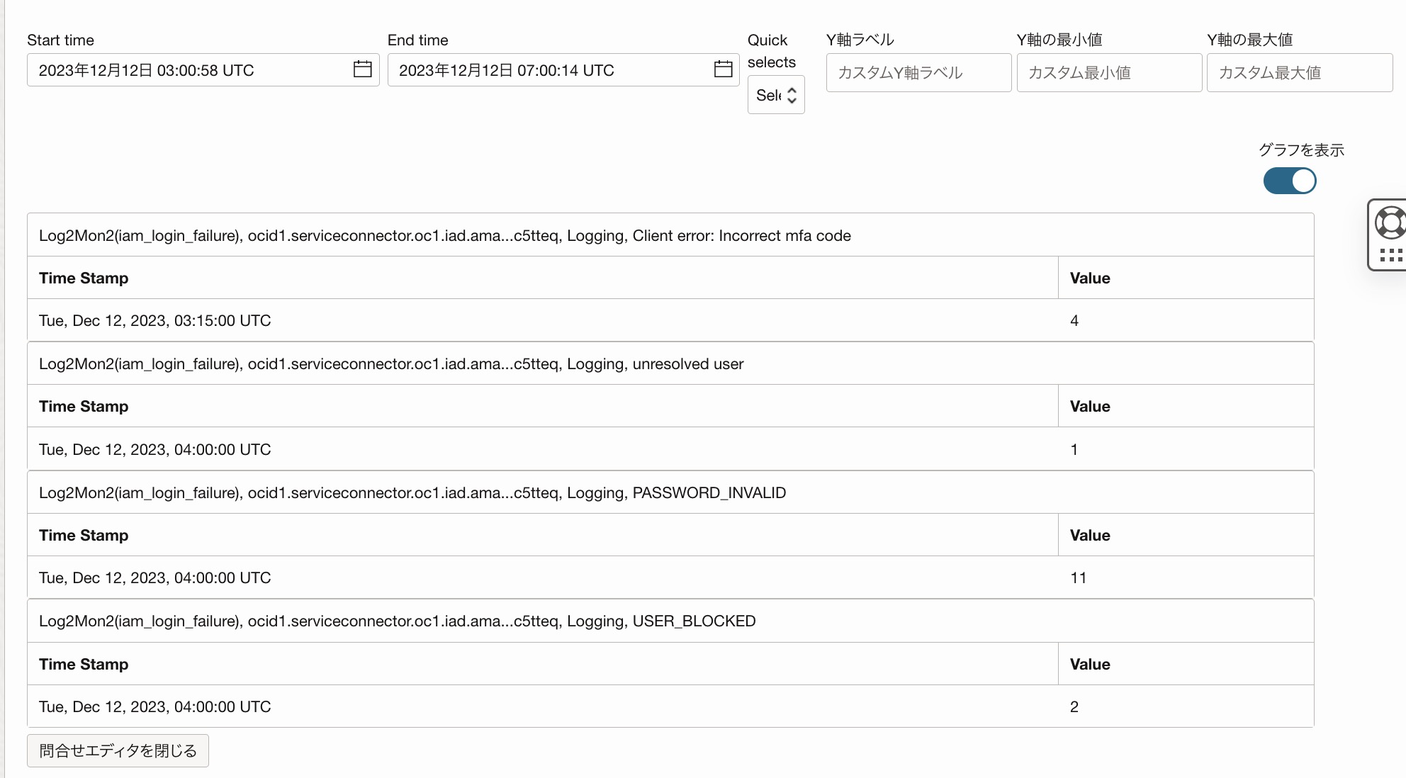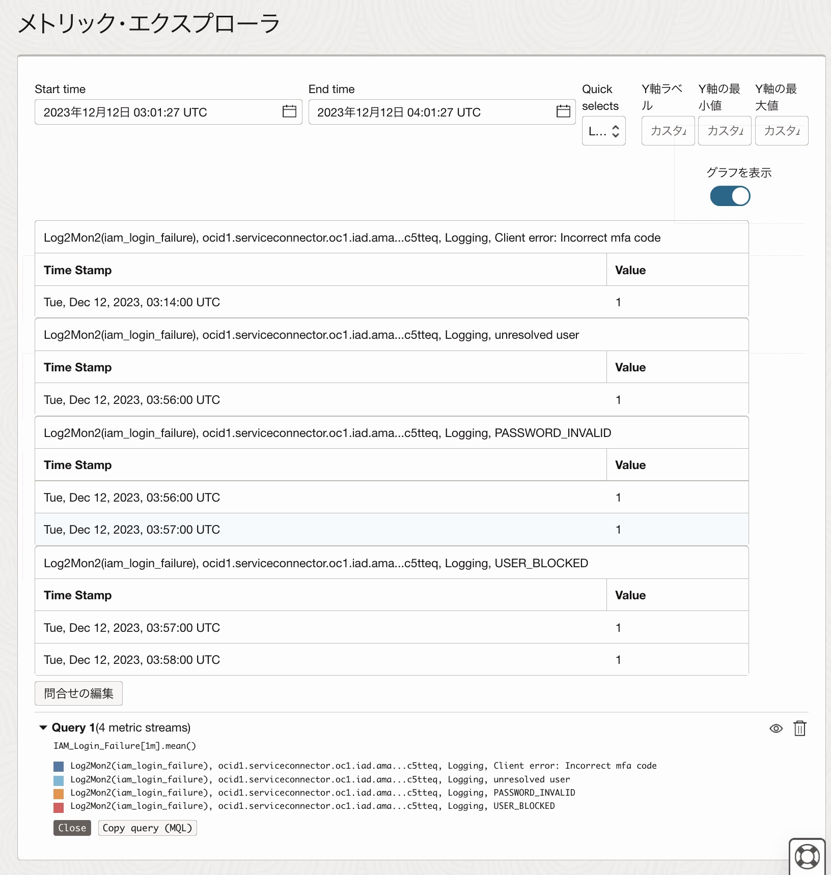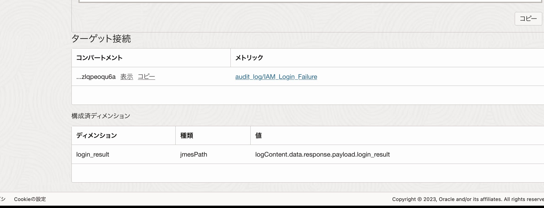ネームスペースの作成し、OCIコンソールからアクセスが可能になるまで時間がかかります。検証環境では、実際にログイン失敗のイベントを起こして、30分程度経つとOCIコンソールで確認できるようになりました。
