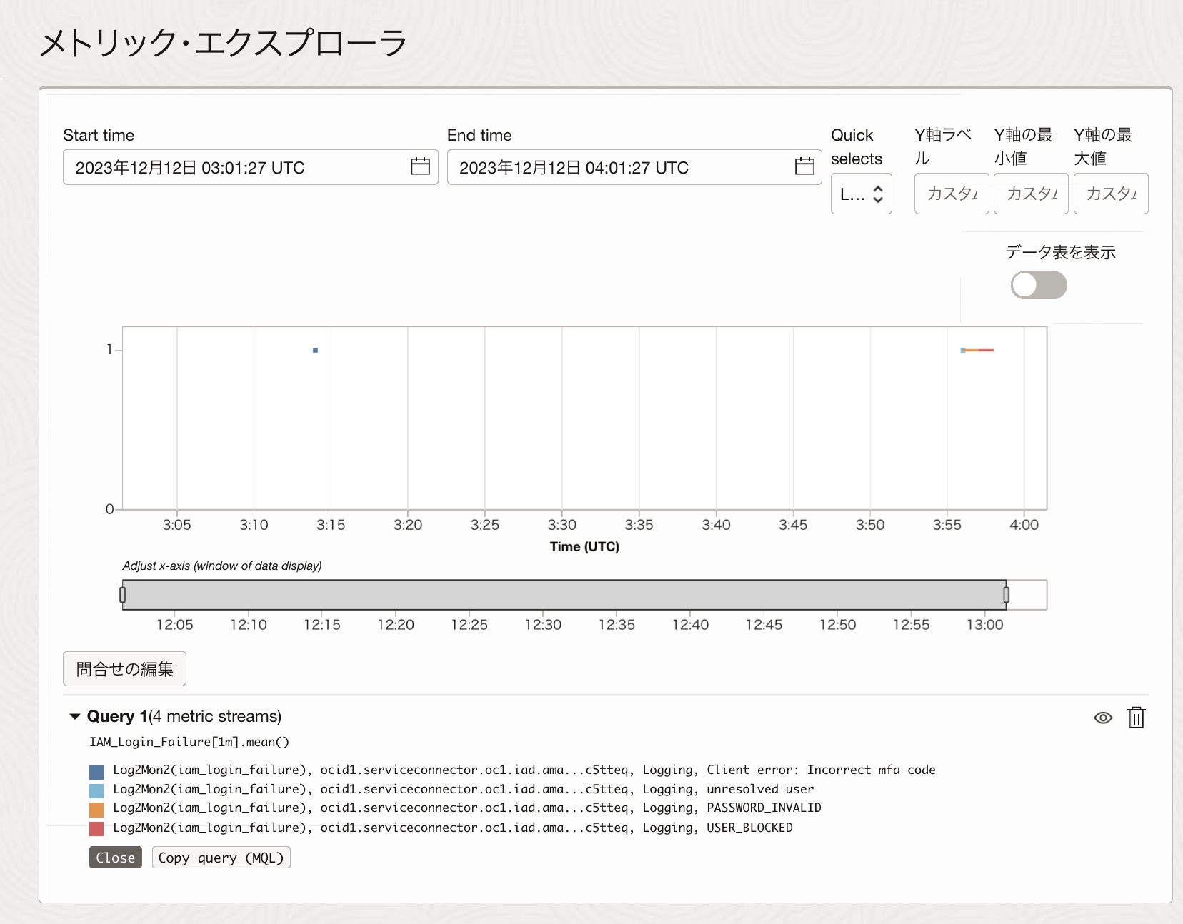 既存のIDCSユーザの出力に寄せたらしく、IDCS統合済みのテナンシでは"sso.authentication.failure"というeventidでイベントを拾うことができます。data.messageのフィールドで、MFAのパスコードNGやパスワード認証NGも、ロック中のアクセスなどの識別ができますが、data.messageの文章量が多く、Monitoring画面で表示しきれないため、ディメンションの追加はお勧めしません。特定イベントに絞る場合は、data.messageの値も含めてServiceConnectorHub側で条件を絞ると良いでしょう。