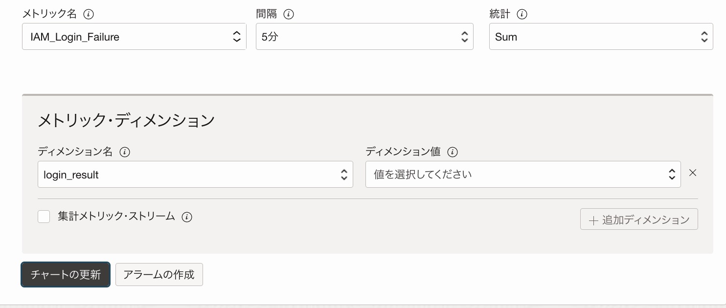 同じように監査ログからServiceConectorHubで連携する際に共通で利用する用途とするため、ネームスペース名は"audit_log"とし、メトリクス名は今回作成する条件に対応する"IAM_Login_Failure"とします。