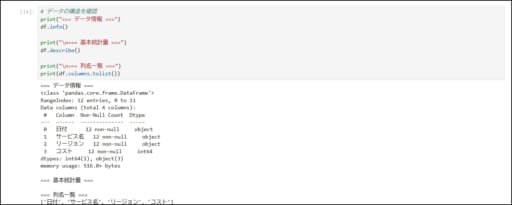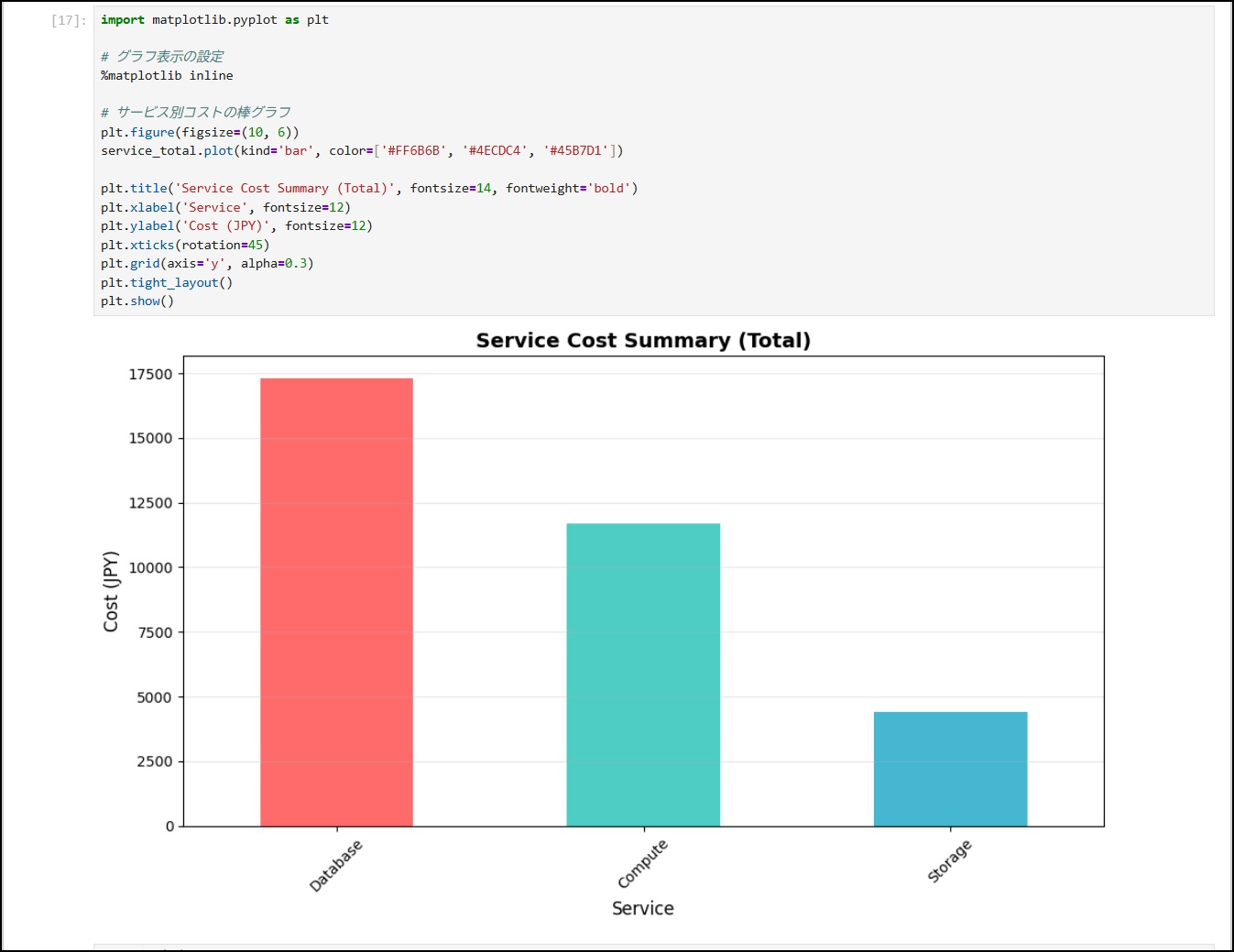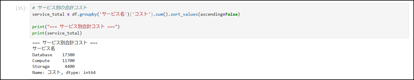 # サービス別の合計コストservice_total = df.groupby('サービス名')['コスト'].sum().sort_values(ascending=False)