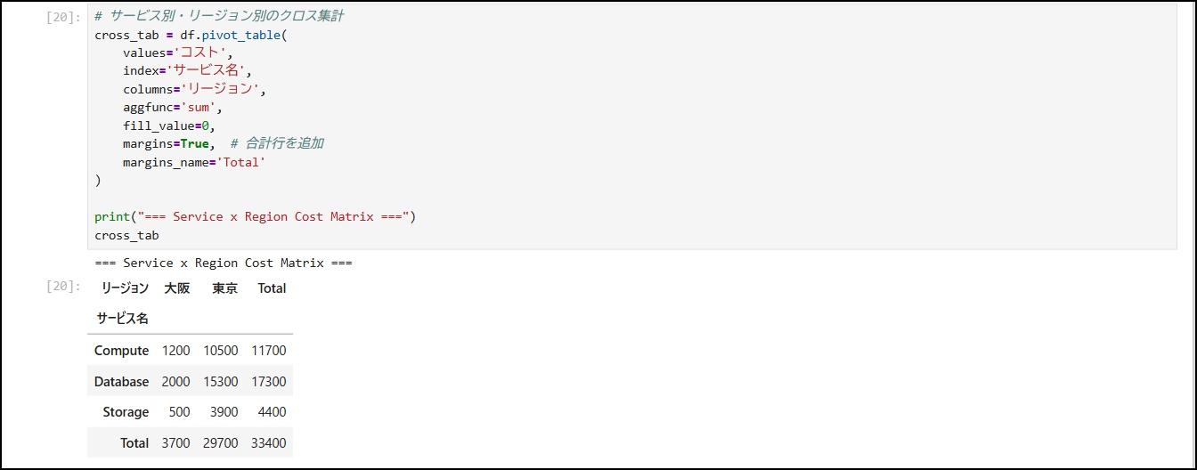 cross_tab = df.pivot_table(values='コスト',index='サービス名',columns='リージョン',aggfunc='sum',fill_value=0,margins=True, # 合計行を追加 margins_name='Total')