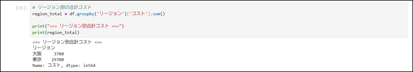 region_total = df.groupby('リージョン')['コスト'].sum()