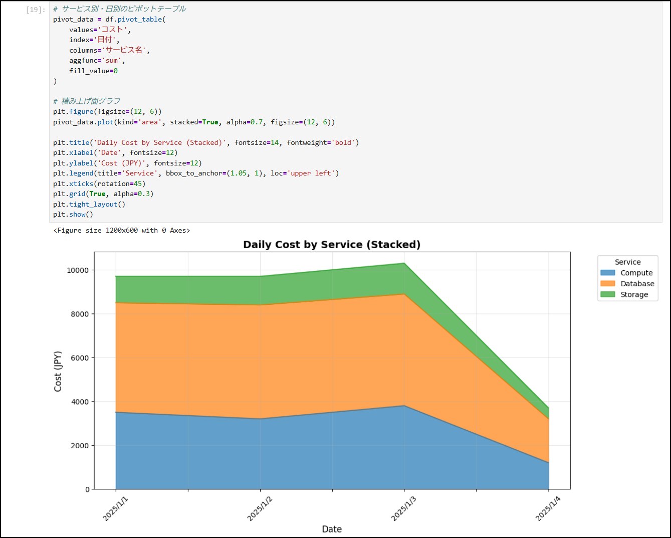 pivot_data = df.pivot_table(values='コスト',index='日付',columns='サービス名',aggfunc='sum',fill_value=0)