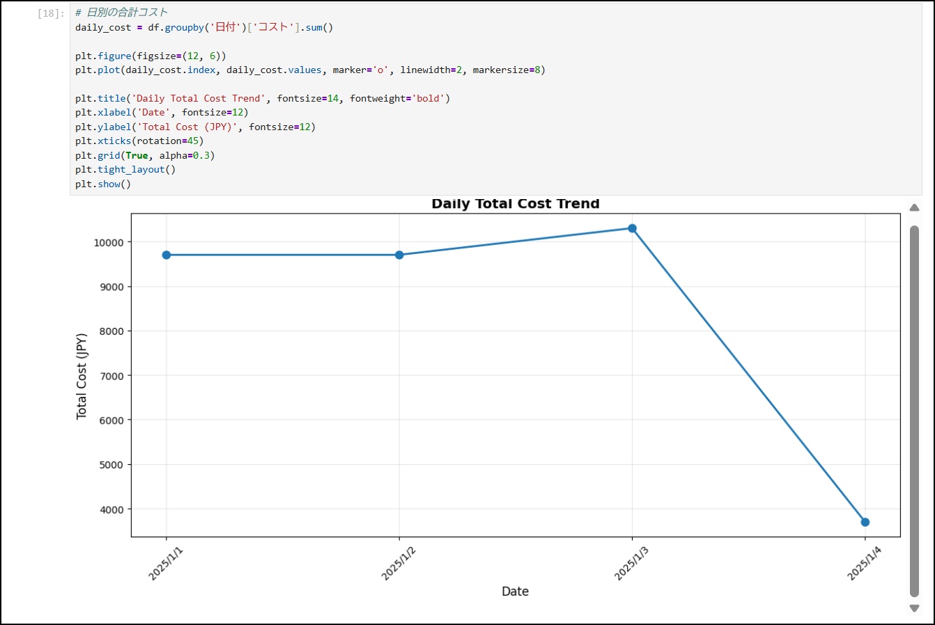daily_cost = df.groupby('日付')['コスト'].sum()