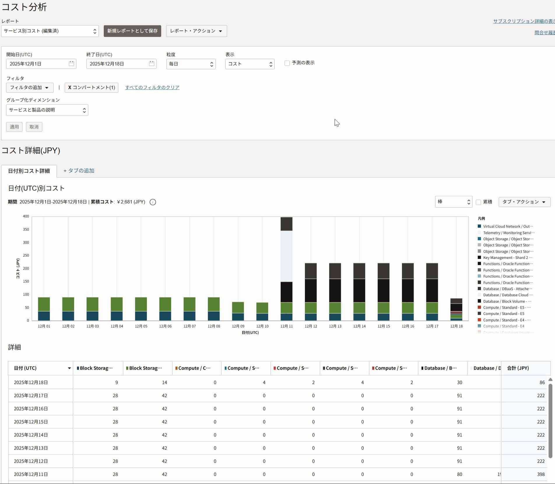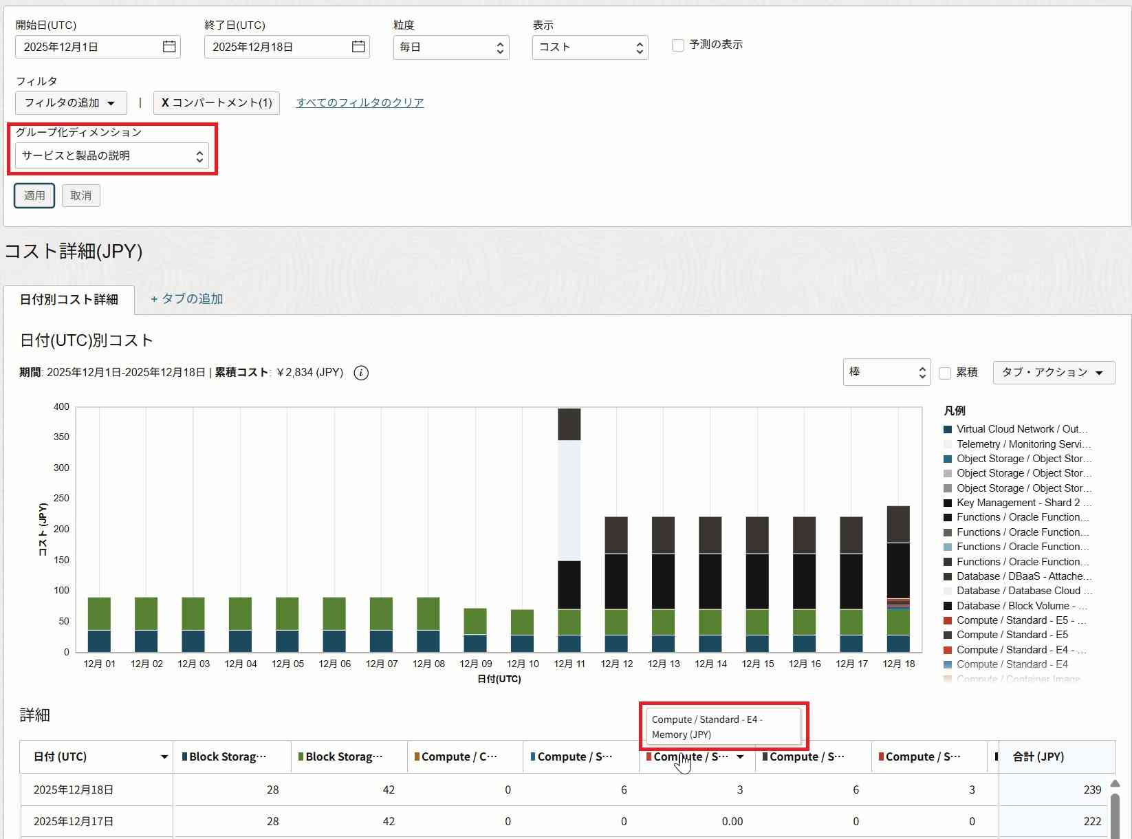もしサービスの種類を詳細に特定したい場合は、「グループ化ディメンション」を「サービスと製品の説明」にすると、コンピュートのシェイプやメモリ等、リソースの詳細を表示できます。