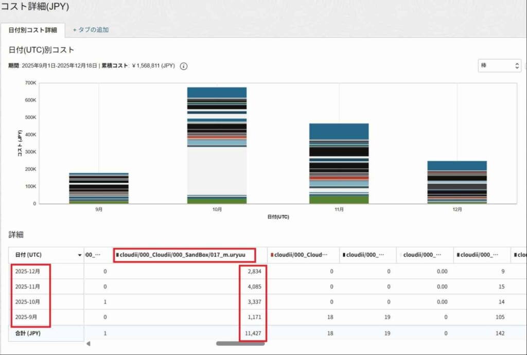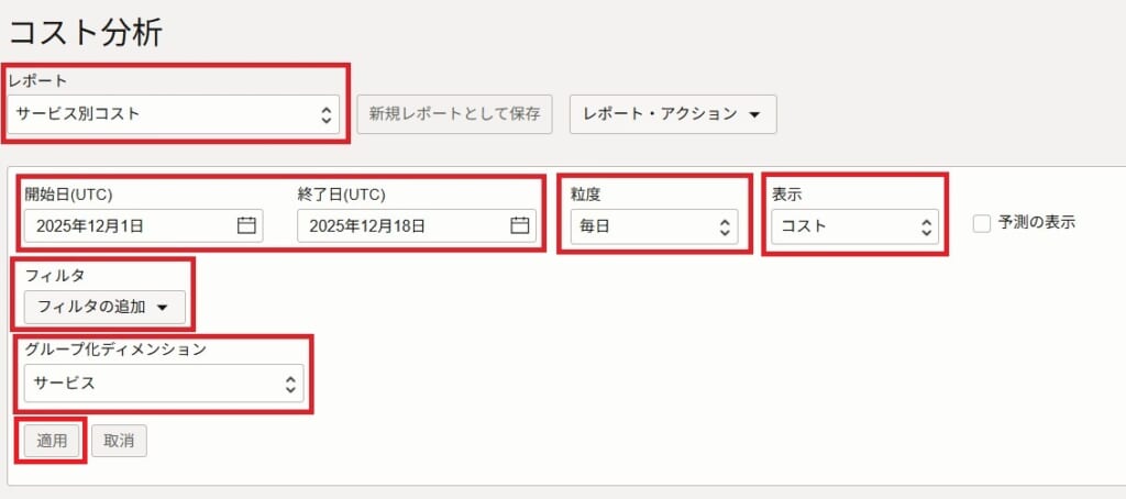 「コスト分析問合せフィールド(赤枠)」を入力し、「適用」をクリックすることで、カスタマイズしたチャートを表示できます。