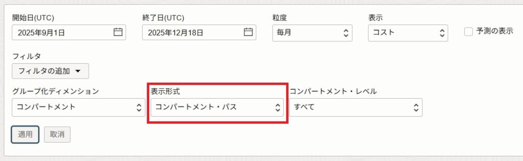 表示形式のデフォルト値は「コンパートメント名」ですが、これは子コンパートメント名のみ表示し、親コンパートメント名が表示されないため、階層が分からなくなります。テナンシ内のコンパートメントが多い場合や、組織管理で複数のテナンシを管理している場合は、コンパートメントの判別が難しくなります。