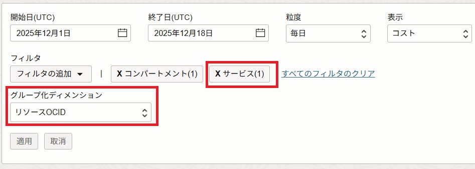 フィルタにサービスが追加されました。「グループ化ディメンション」で「リソースOCID」を選択して、OCIDが表示されるようにします。