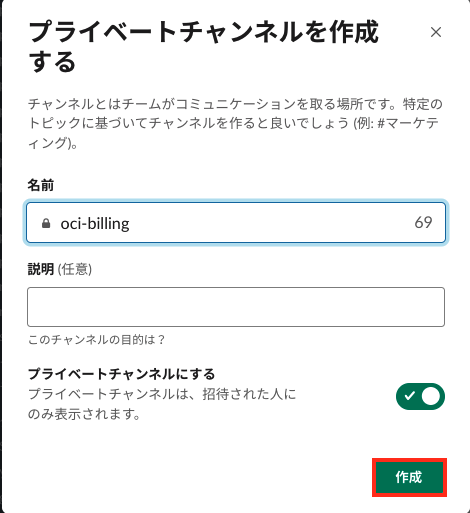 チャンネル名(ここでは「oci-billing」)を入力後、「作成」を選択します。
