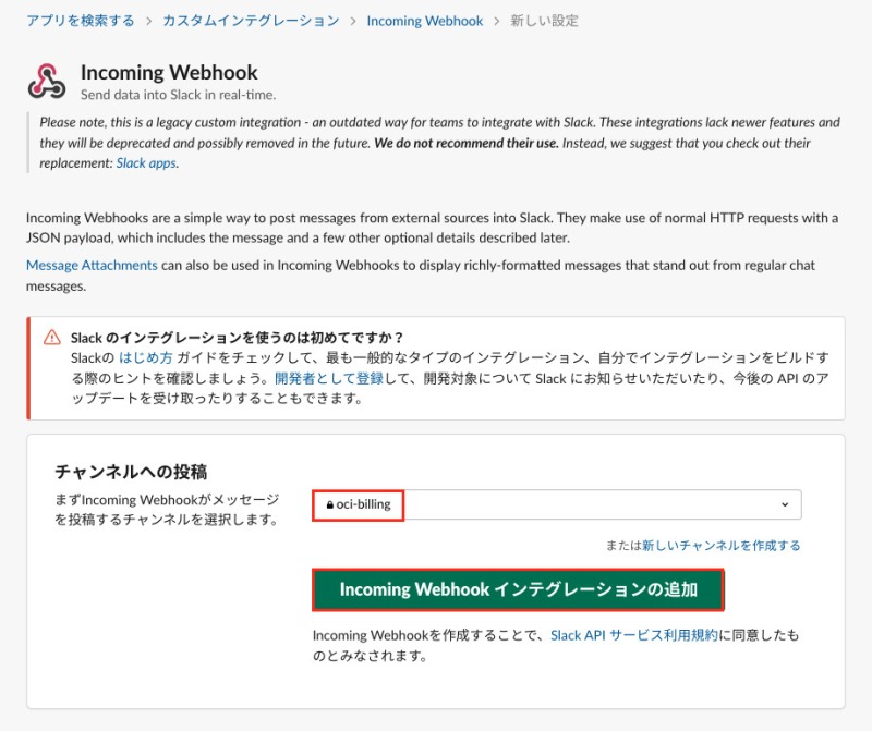作成したチャンネル名(ここでは「oci-billing」)を入力し、「Incoming Webhook インテグレーションの追加」を選択します。