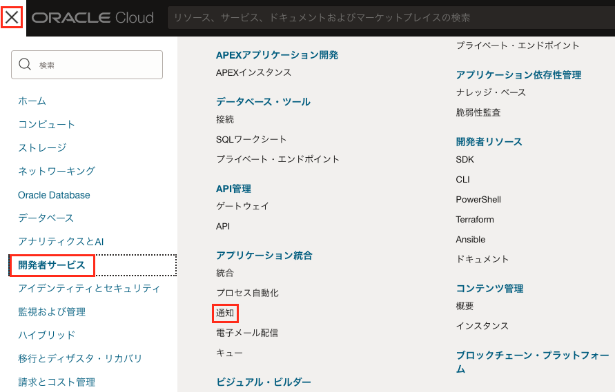 OCIコンソール画面左上のハンバーガーアイコンから「開発者サービス」→アプリケーション統合内の「通知」を選択します。