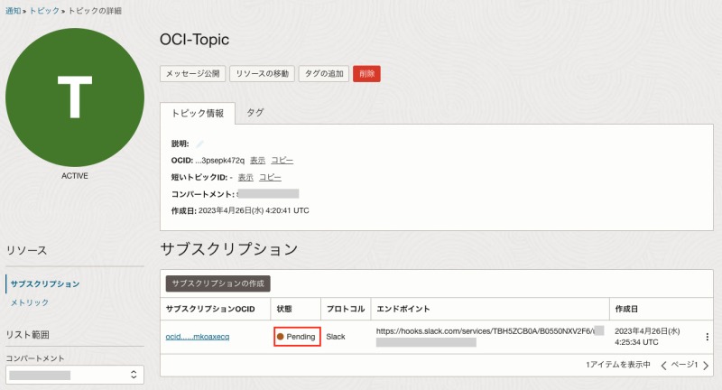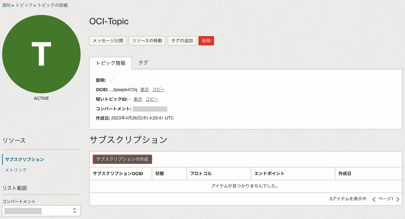 - 通知コンパートメント:トピックを設定したコンパートメント