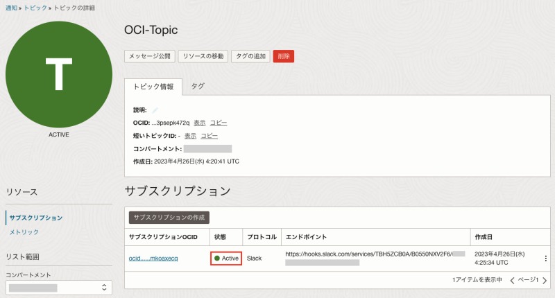 続いて、OCIの通知サービスとSlackのチャンネルを連携する作業を行います。